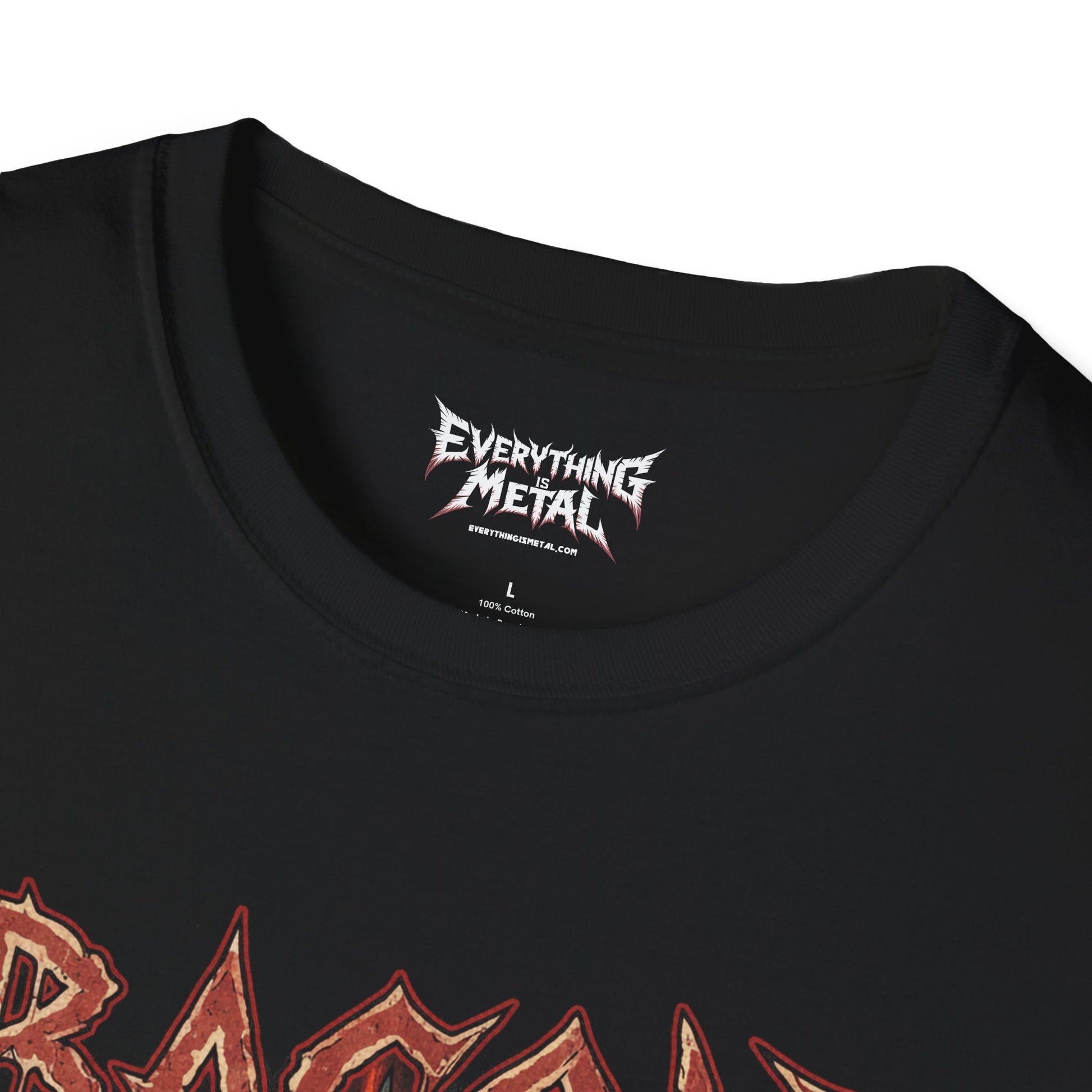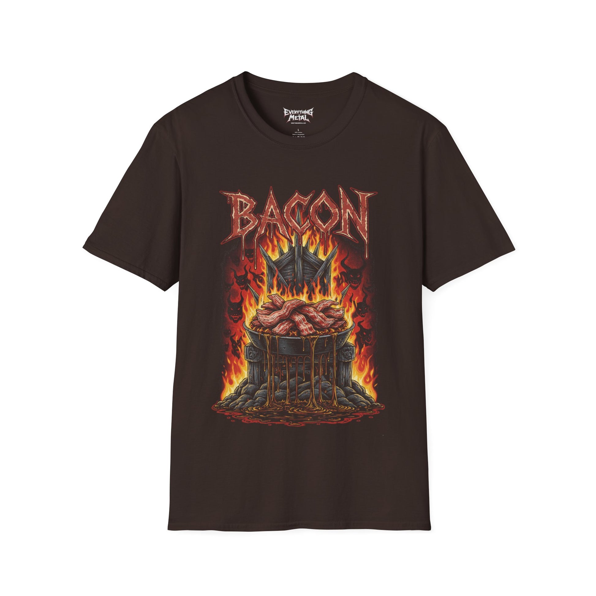 All hail the Lord of Breakfast! This brutal metal-band–style shirt features a fiery throne forged from a frying pan, stacked high with sizzling strips of bacon dripping molten fat and fury. With demonic flames and infernal detail, this design pays tribute to the most sacred of meats. Perfect for metalheads who bow before the altar of salt, smoke, and chaos. Printed on ultra-soft black cotton — built for headbangers, grill masters, and grease-stained gods
