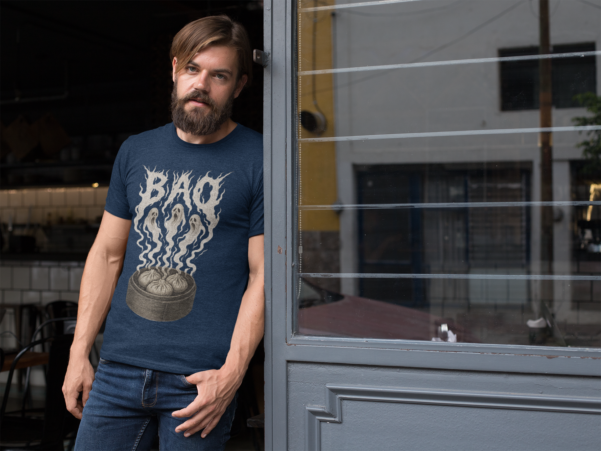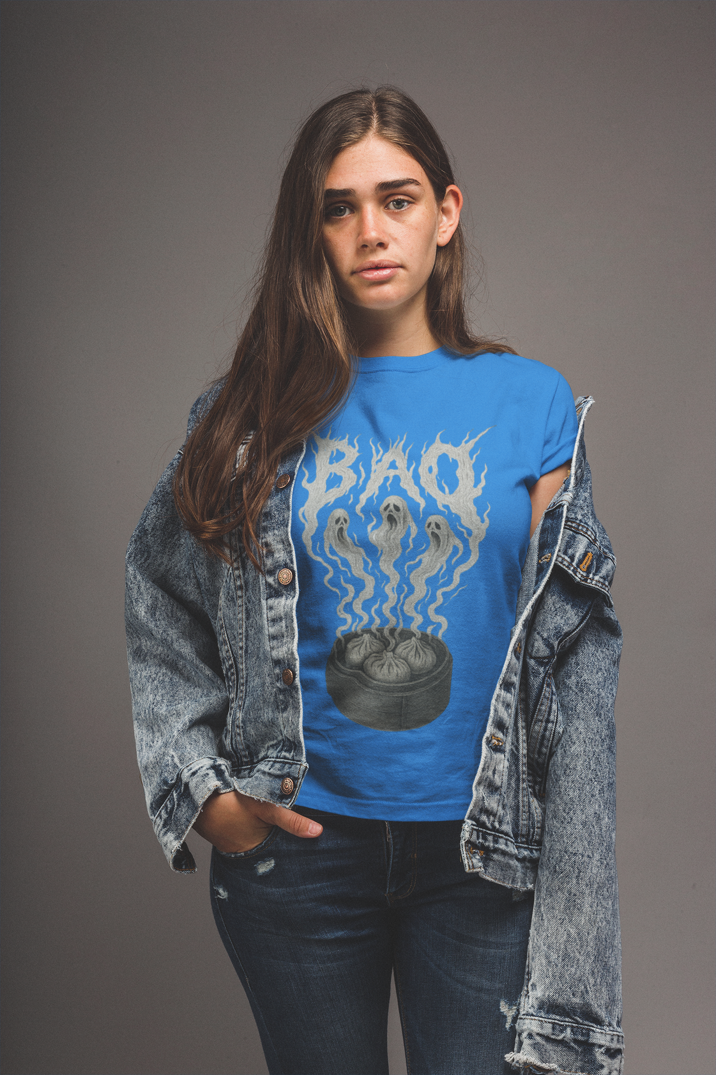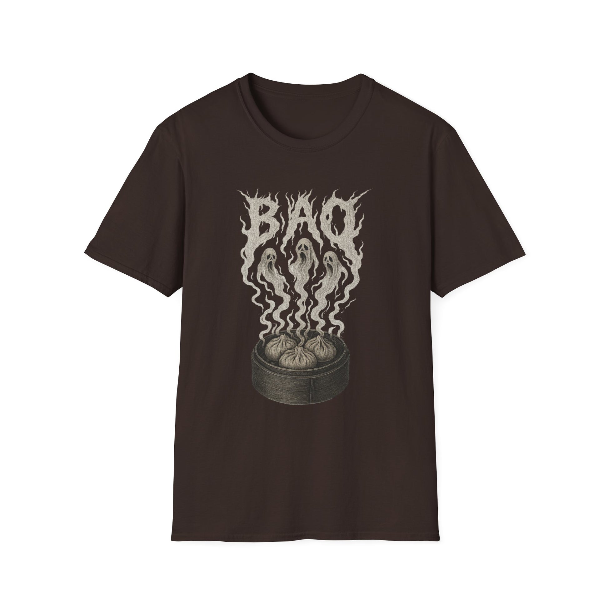 Summon the Spirits of the Steamer with BAO, the ultimate fusion of dim sum and doom! This parody tee unleashes plump bao buns surrounded by eerie, curling steam shaped like restless ghosts. Rendered in the grim grandeur of an old-school death-metal album cover, the design drips with jagged fonts, spectral swirls, and tongue-in-cheek terror. Perfect for metalheads, foodies, and anyone who loves their snacks served hot with a side of haunting, this shirt is a must-have for fans of savage riffs and steamed delights alike.