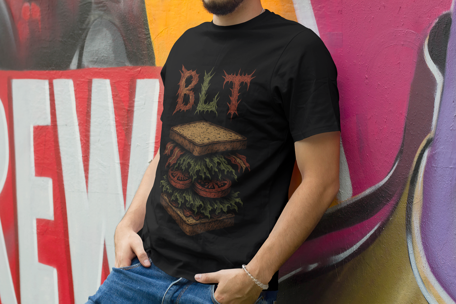 Bring the crunch to the pit with BLT: Bacon, Lettuce & Thrash — the loudest sandwich in the scene! This parody death-metal tee reimagines the classic BLT as a raging mascot: crisp bacon riffs, lettuce shreds, and tomato slices dripping with chaos, all framed in jagged band lettering. Perfect for headbangers, foodies, and anyone who thinks lunch deserves a killer soundtrack, this shirt serves up savage style and tasty attitude in one legendary bite.