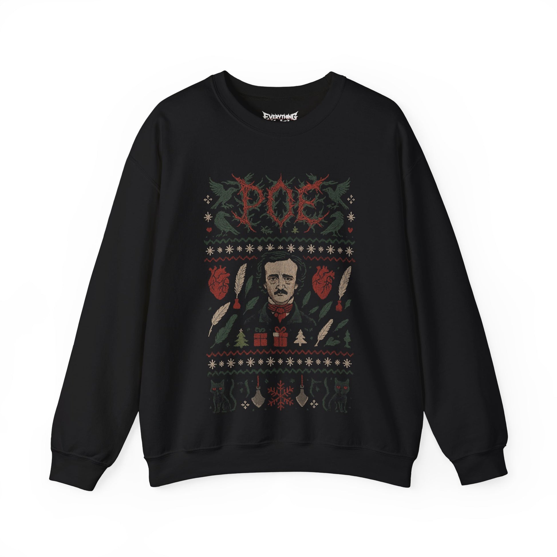 This Edgar Allan Poe Ugly Christmas Sweater is the perfect mix of macabre and merry. Featuring a brooding portrait of Poe surrounded by familiar motifs—ravens, hearts, quills, black cats and pendulums —this design fuses literary darkness with festive flair. Cozy, creepy, and perfect for horror fans and lovers of classic gothic literature who prefer their carols with a touch of dread.