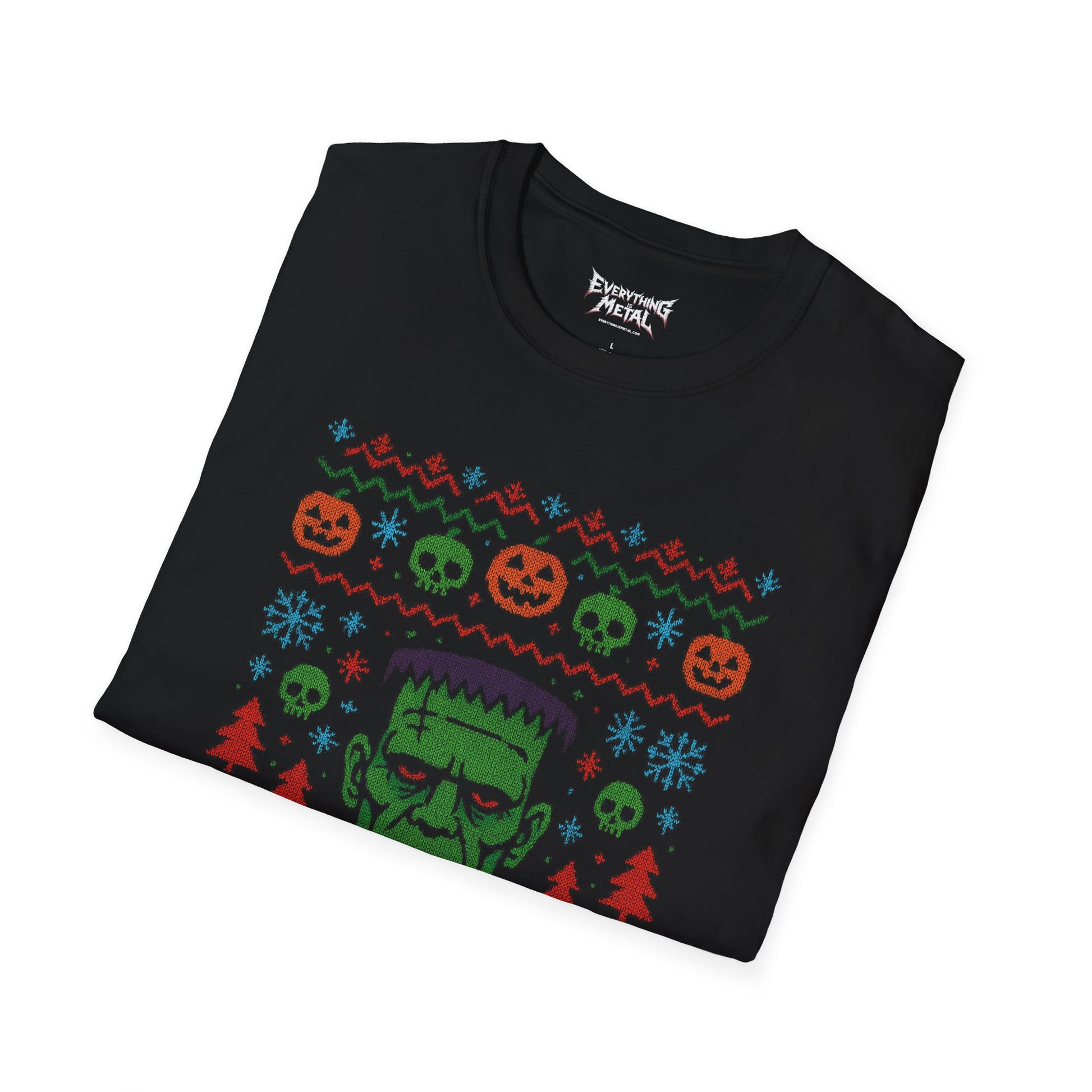 Bring your holiday style back from the dead with this Frankenstein’s Monster Ugly Christmas Sweater design T-Shirt featuring a classic green monster surrounded by skulls, bats, pumpkins, and festive snowflakes, this creepy-cute design fuses horror and holiday cheer. Perfect for monster movie fans, gothic souls, and anyone who celebrates Christmas with a little electricity.