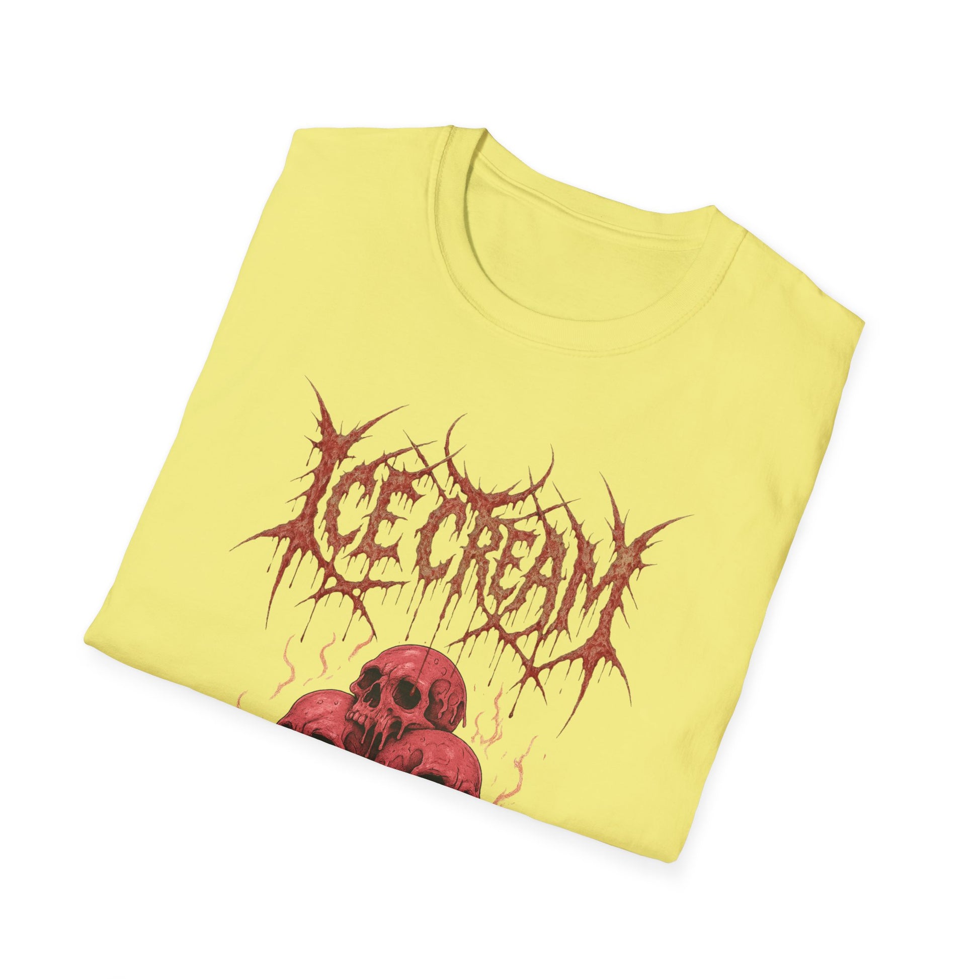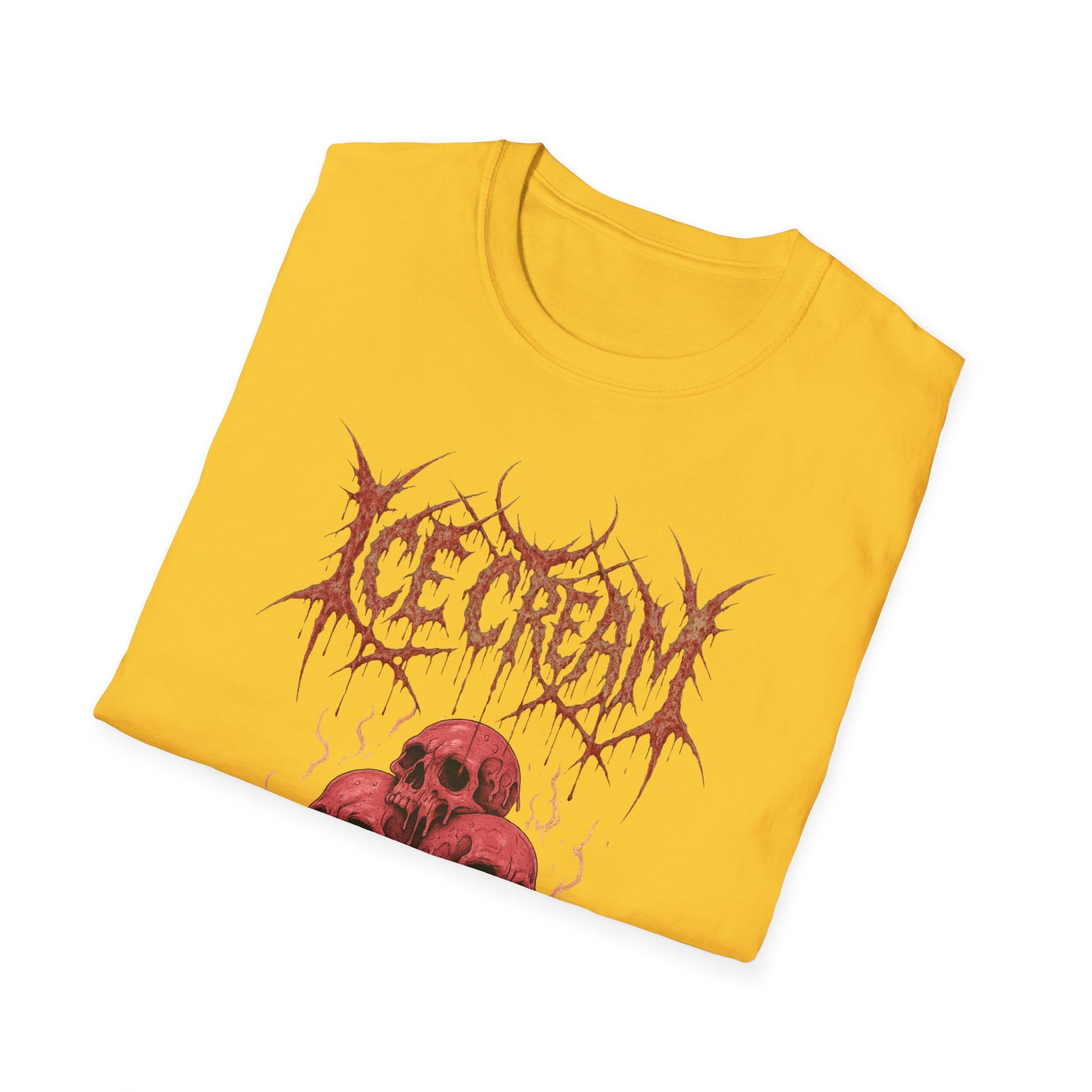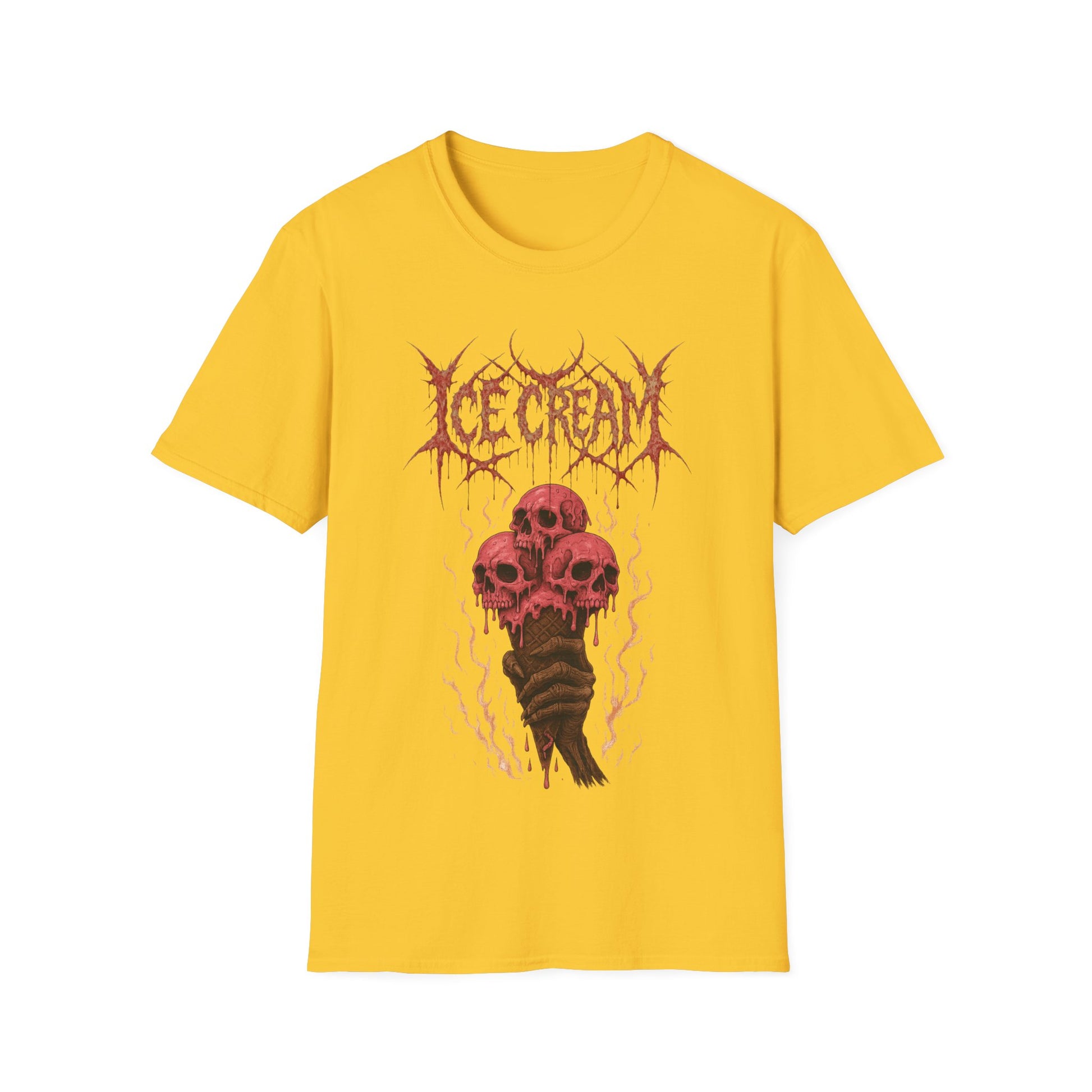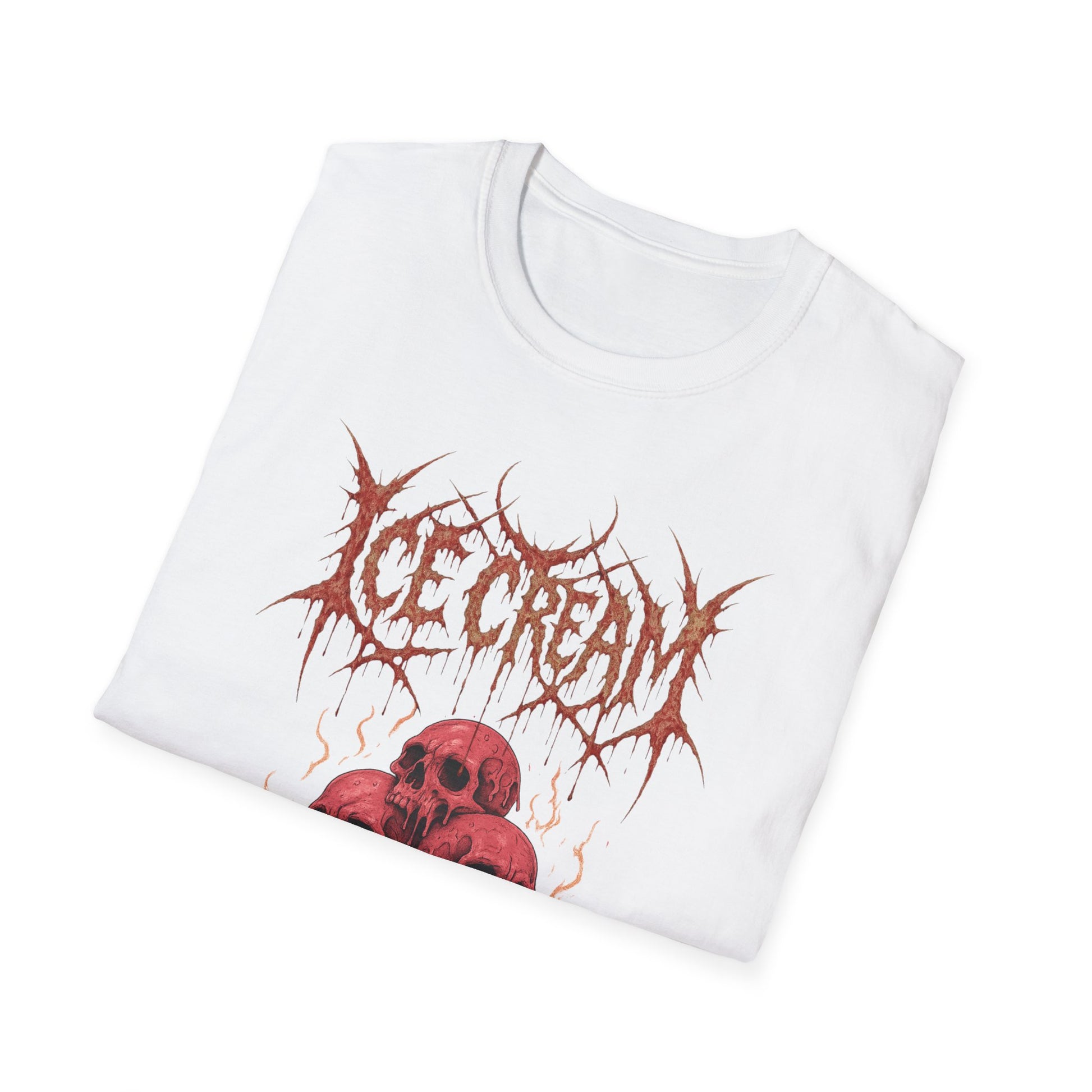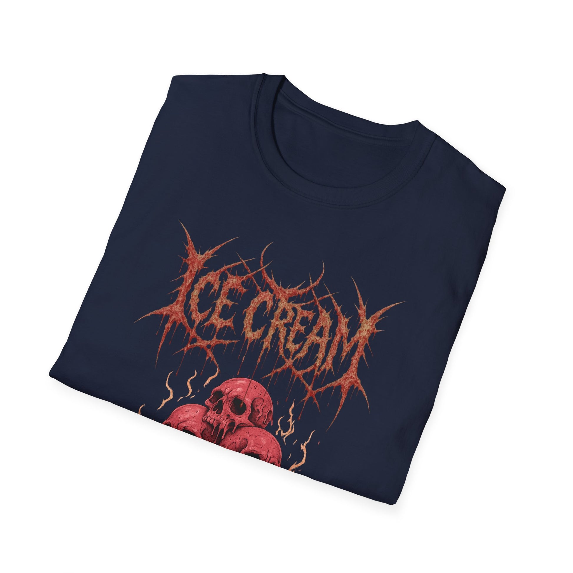 Scoop up some darkness with this brutal parody tee! Featuring ice cream cones topped with gooey skulls, the design channels the raw energy of a classic heavy metal band shirt—bold, jagged lettering, high-contrast artwork, and a wickedly cold aesthetic. Equal parts chilling and killer, it’s the perfect mashup of sweet treats and savage riffs. Whether you’re a metalhead, a horror fan, or just someone who likes their dessert served with a side of icy death, this shirt is guaranteed to melt faces in true headbanger style.