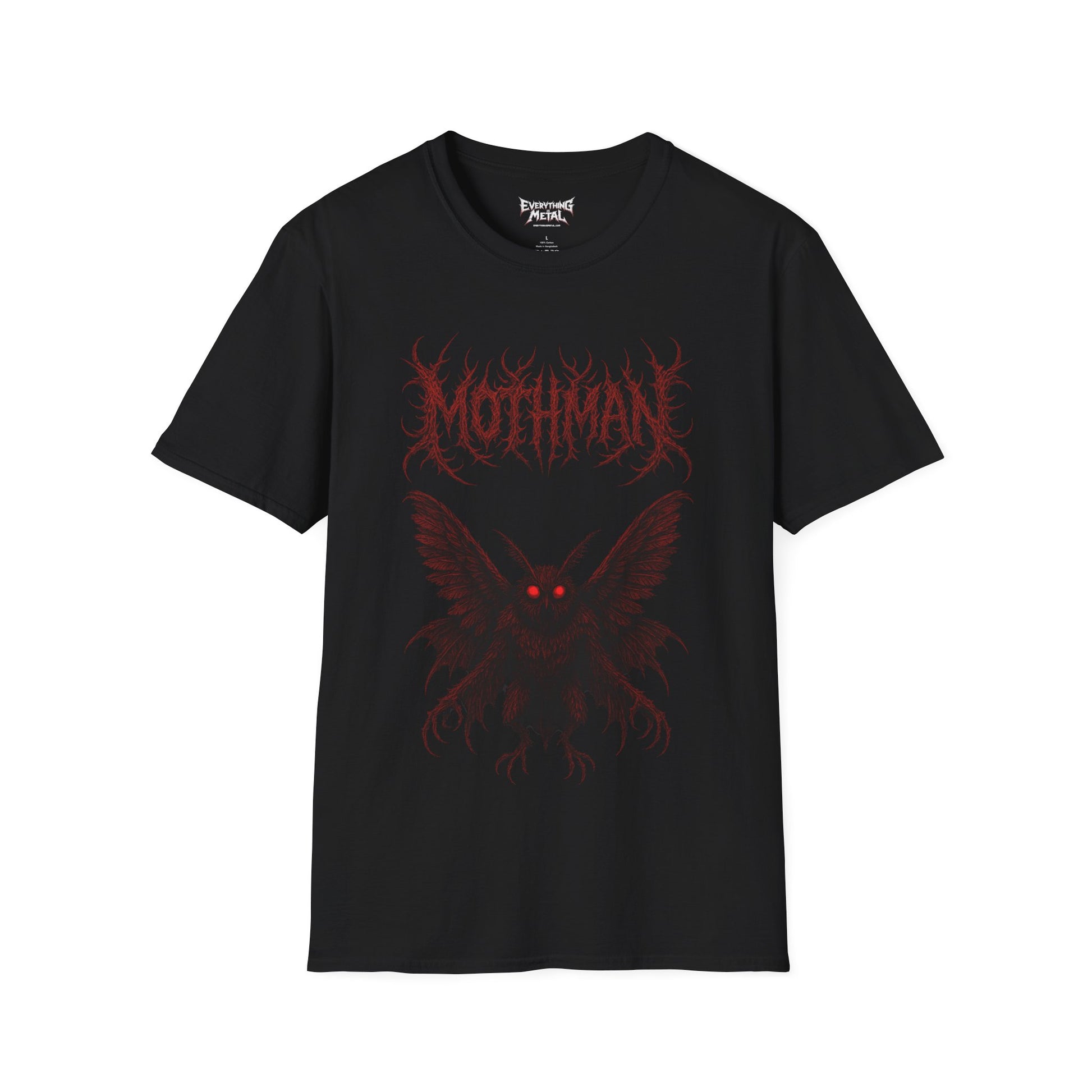 From the shadows of Point Pleasant, the red-eyed omen of doom spreads its wings in this haunting black metal–style design. The Mothman emerges in crimson detail beneath a razor-edged logo that glows like warning lights in the dark. Perfect for believers in the paranormal, cryptid collectors, and fans of eerie folklore and heavy riffs. Printed on ultra-soft black cotton for comfort that’s anything but human.