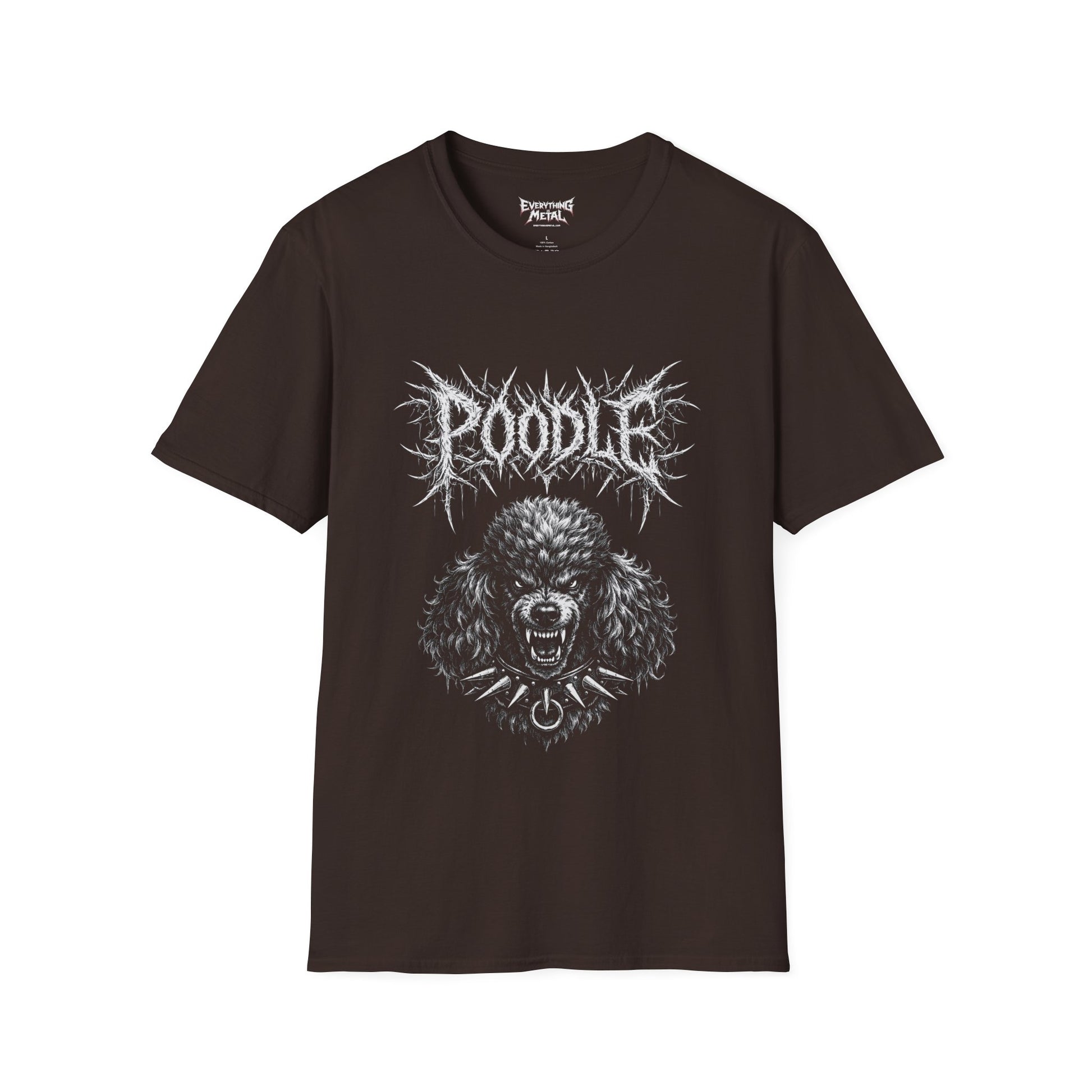 Printed in high-contrast artwork on a black shirt, the detailed illustration pops with classic metal-merch aesthetics—perfect for concerts, dog park domination, or everyday streetwear. It's the ultimate conversation starter for anyone who knows that even poodles can go full death metal.