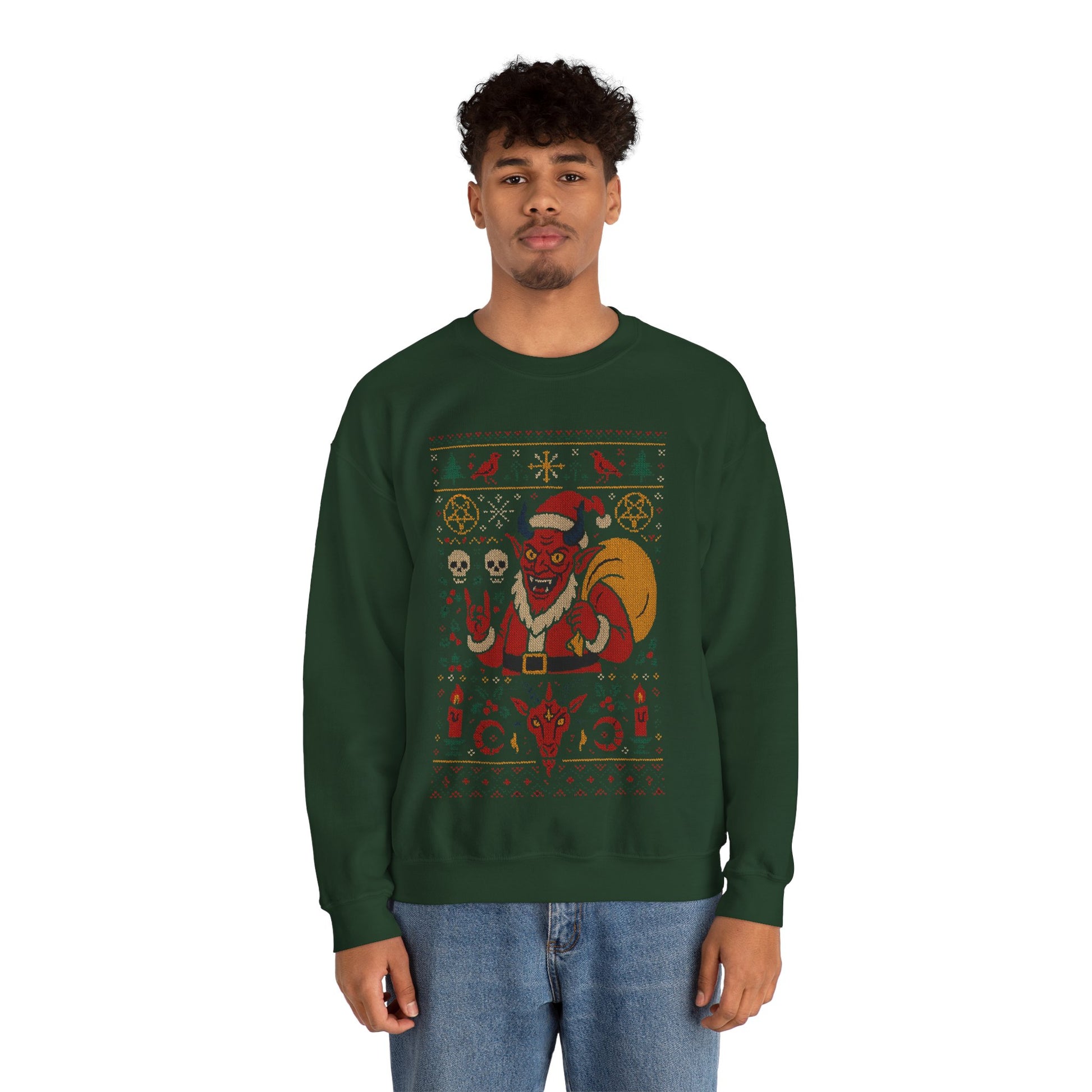 Make your holidays unholy with this wickedly festive “Satan Claus” ugly Christmas sweater! Featuring the Devil himself decked out as Santa, complete with skulls, pentagrams, candles, and the horns of holiday doom. Perfect for metalheads, goths, and anyone who’d rather deck the halls with darkness than cheer. Cozy, rebellious, and 100% festive blasphemy.