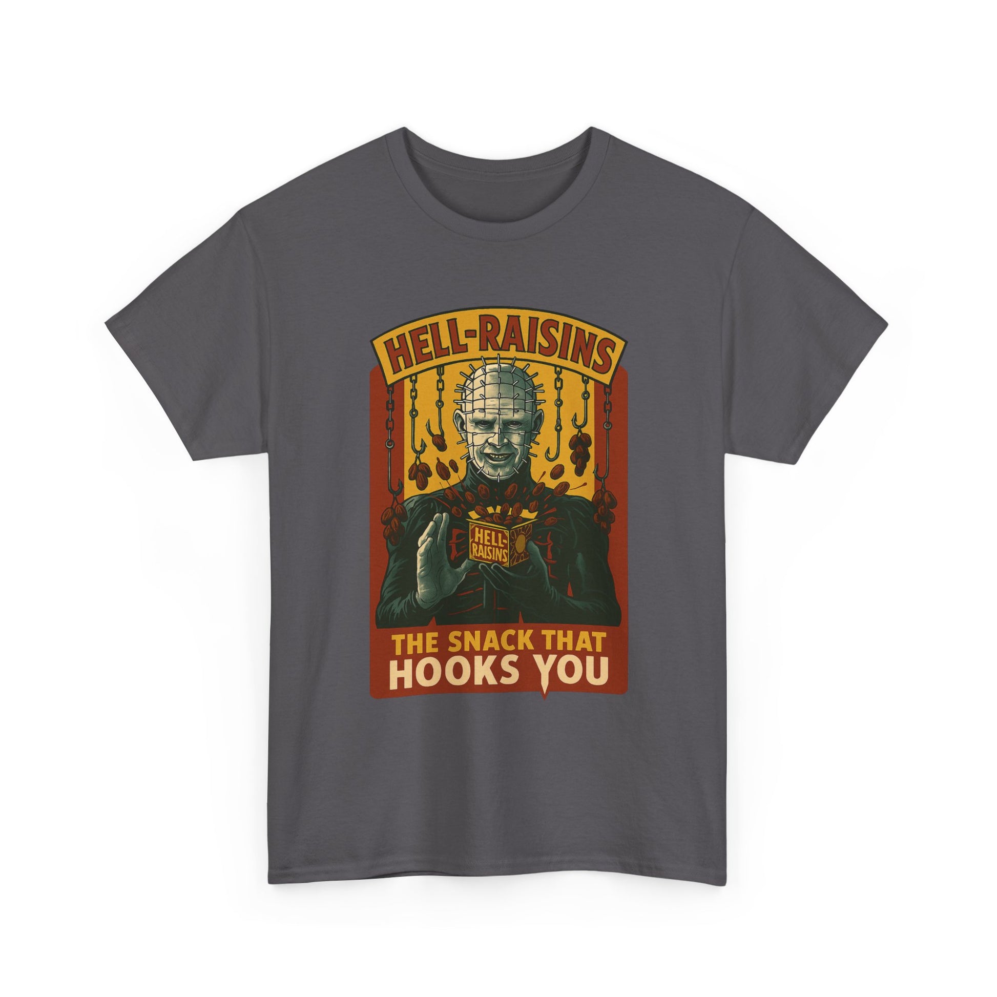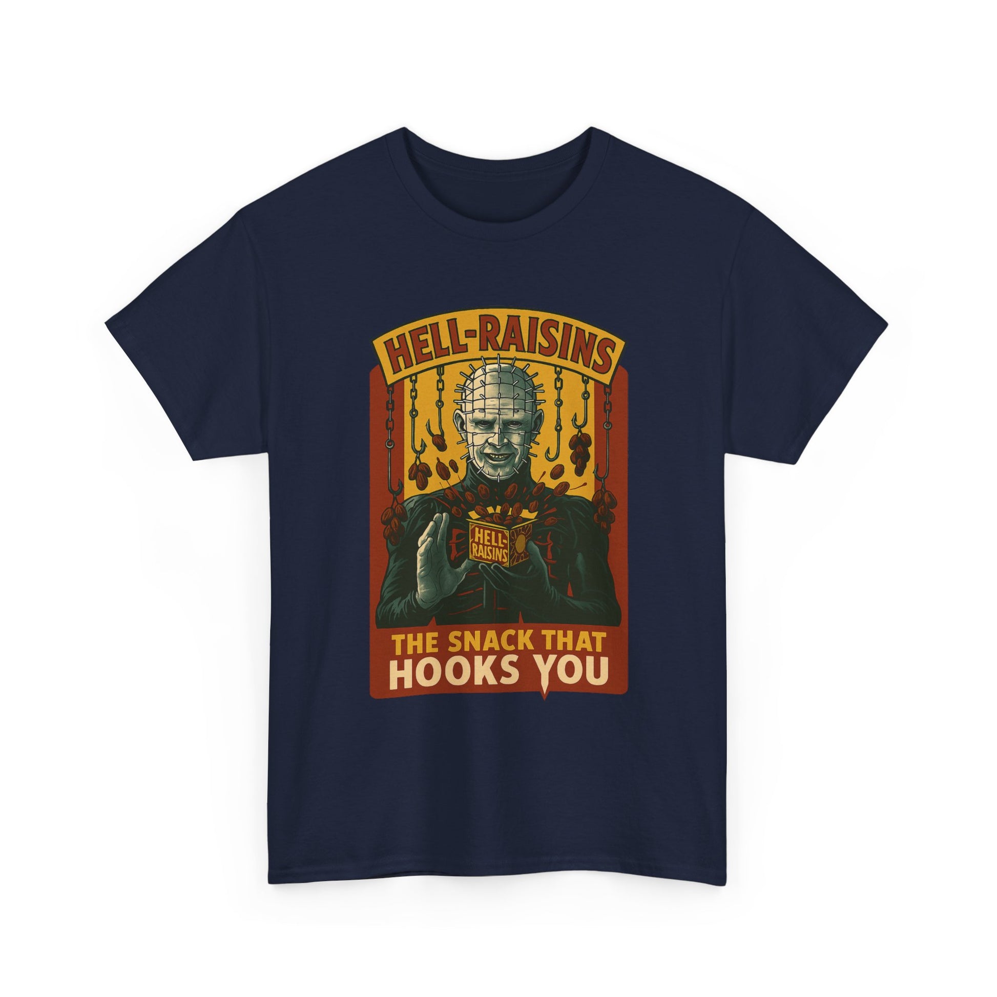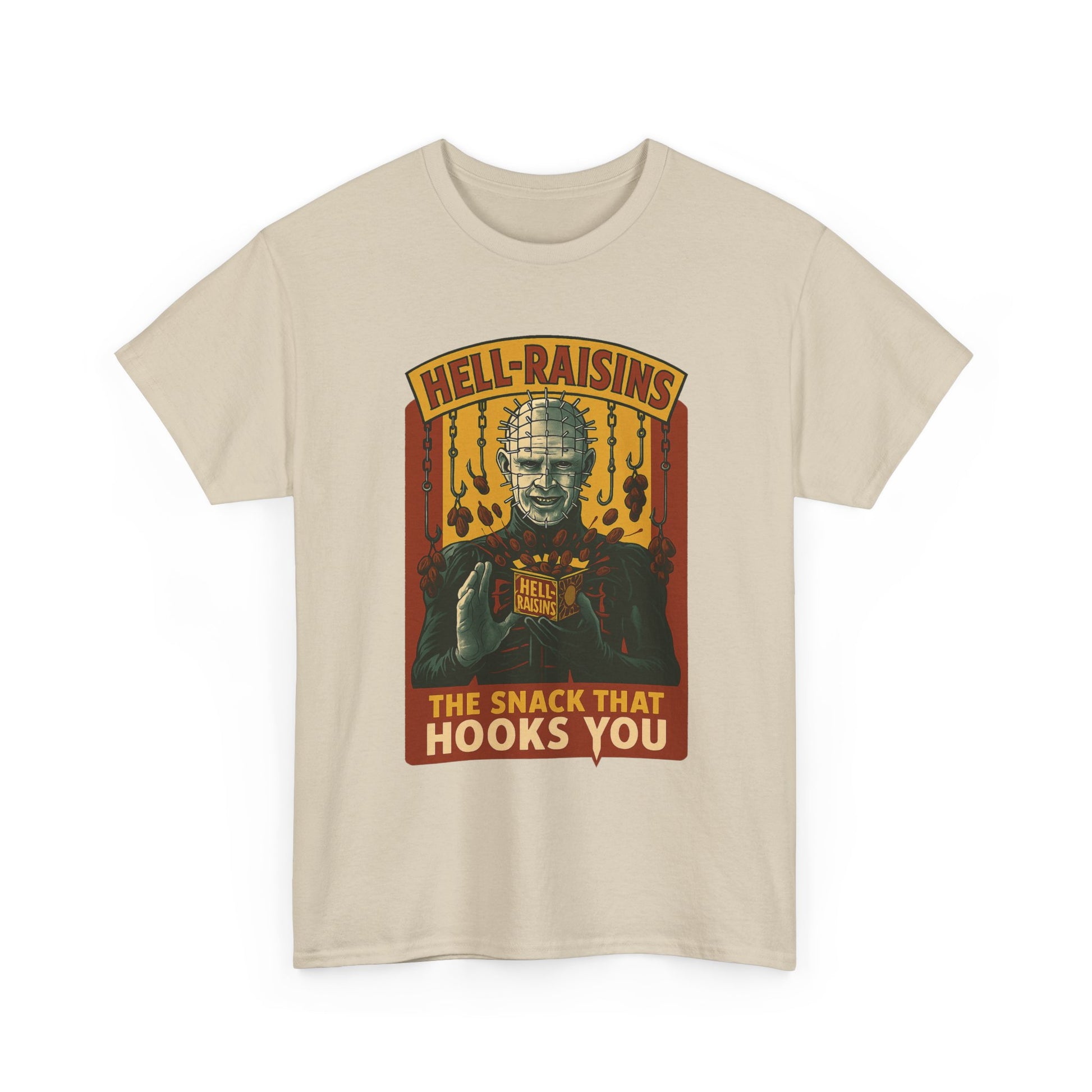 Unbox a snack straight from the depths of the labyrinth! This parody tee reimagines Pinhead from Hellraiser as the smiling salesman of Hell-Raisins, packaged in his iconic Lament Configuration box. Styled like a cheerful 1950’s print ad, the design drips with retro charm and dark humor—vintage lettering, wholesome ad vibes, and a Cenobite twist on everyone’s favorite dried fruit. Equal parts kitschy and creepy, this shirt is perfect for horror fans, retro design lovers, and anyone who thinks a healthy snack should come with a side of eternal torment.