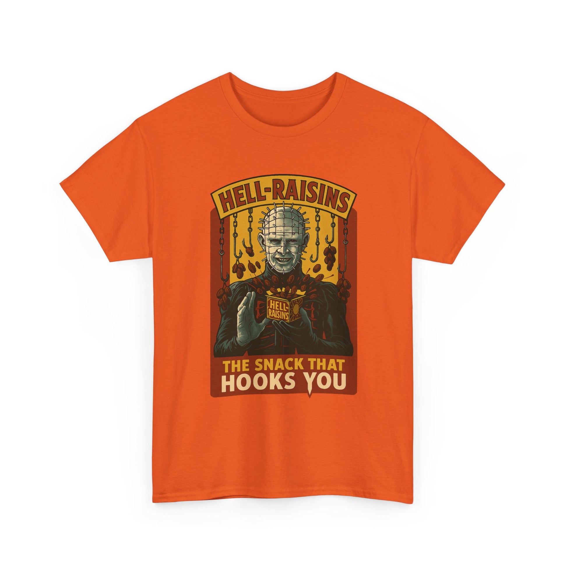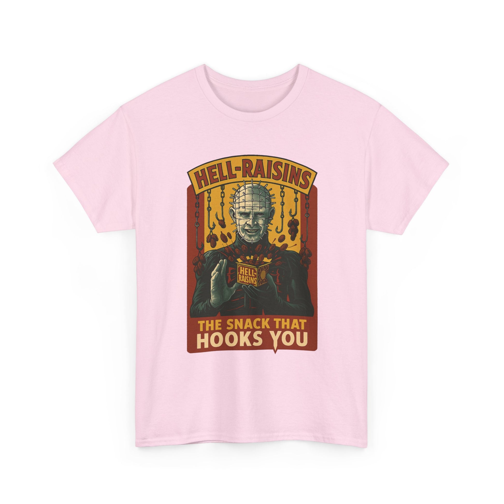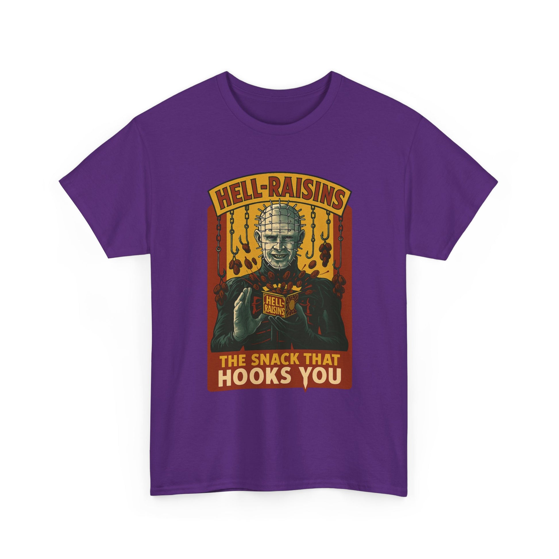 Unbox a snack straight from the depths of the labyrinth! This parody tee reimagines Pinhead from Hellraiser as the smiling salesman of Hell-Raisins, packaged in his iconic Lament Configuration box. Styled like a cheerful 1950’s print ad, the design drips with retro charm and dark humor—vintage lettering, wholesome ad vibes, and a Cenobite twist on everyone’s favorite dried fruit. Equal parts kitschy and creepy, this shirt is perfect for horror fans, retro design lovers, and anyone who thinks a healthy snack should come with a side of eternal torment.